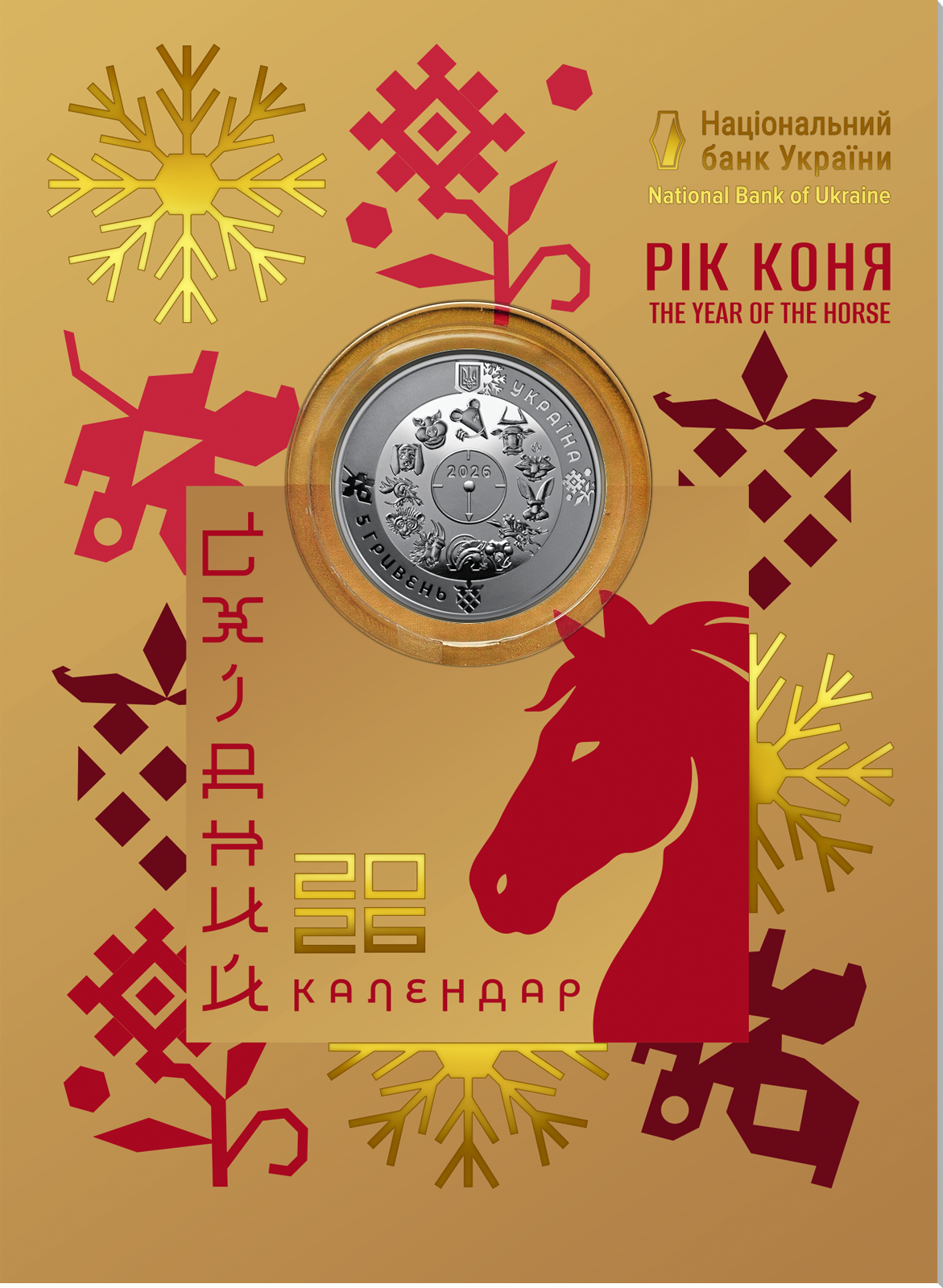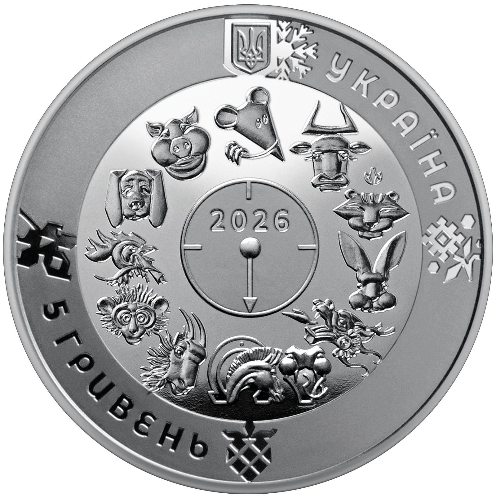 На аверсі монети розміщено: угорі – малий Державний Герб України, праворуч від якого напис півколом УКРАЇНА; на дзеркальному тлі по колу зображені 12 символів східного календаря, у центрі кола – стилізований годинник зі стрілкою, що вказує на коня – символ року, над стрілкою – 2026; унизу ліворуч напис півколом 5 ГРИВЕНЬ; на матовому тлі зображені стилізовані під українську витинанку символи кожної пори року: сніжинка (угорі), квітка (праворуч), ягода (унизу), листок (ліворуч); логотип Банкнотно-монетного двору Національного банку України (праворуч над символом тигра).